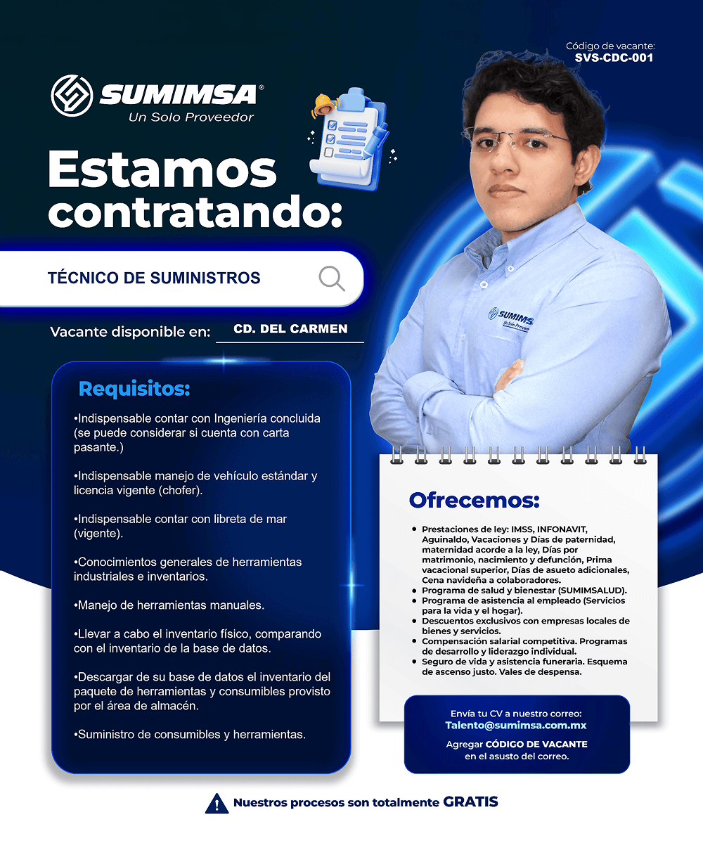 Recuerda que nuestros procesos de selección y aplicación a la vacante son gratuitos.